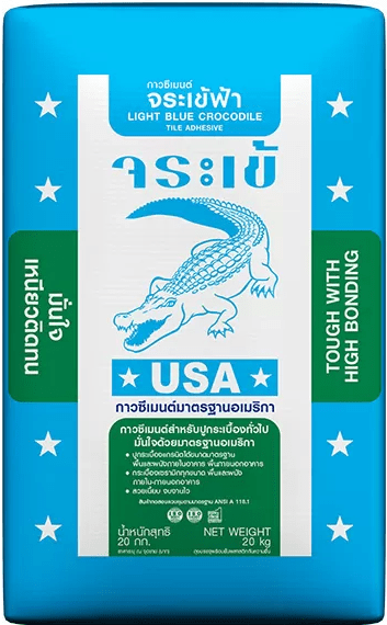กาวซีเมนต์จระเข้ฟ้า ประกอบด้วยปูนซีเมนต์ปอร์ตแลนด์ ทรายละเอียดคัดพิเศษ และวัสดุผสมพิเศษอื่น ๆ ทำให้ผลิตภัณฑ์ มีคุณสมบัติที่ให้การยึดเกาะสูง กาวซีเมนต์ จระเข้ฟ้า ใช้สำหรับงานปูกระเบื้องเซรามิกทั่วไป ใช้ได้ทั้งพื้นและผนังภายในอาคาร โดยไม่ต้องแช่กระเบื้องก่อนปู